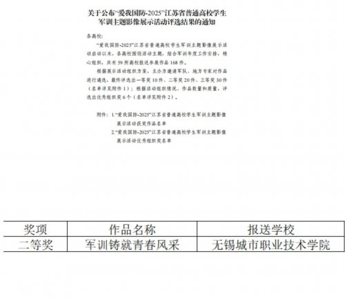 近日,江苏省学校国防教育和军事课教学指导委员会公布“爱我国防”江苏省普通高校学生军训主题影像展示活动评选结果。我校选送的作品——《军训铸就青春风采》凭借鲜明的主题、生动的影像表达和深刻的国防教育内涵,在全省59所高校报送的168件作品中脱颖而出,荣获二等奖,为学校争得荣誉。